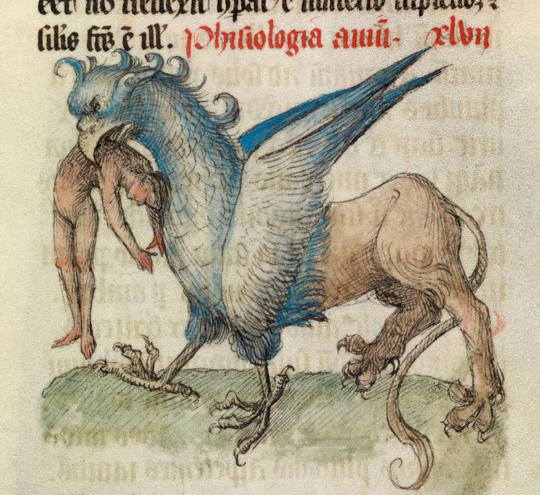 Griffin, 1460, from Liber Floridus compiled by Lambert, canon of Saint Omer. Parchment. Leaf: 40.8 × 28.6 cm (16 1/16 × 11 1/4 in.). The Hague, Koninklijke Bibliotheek, National Library of the Netherlands
